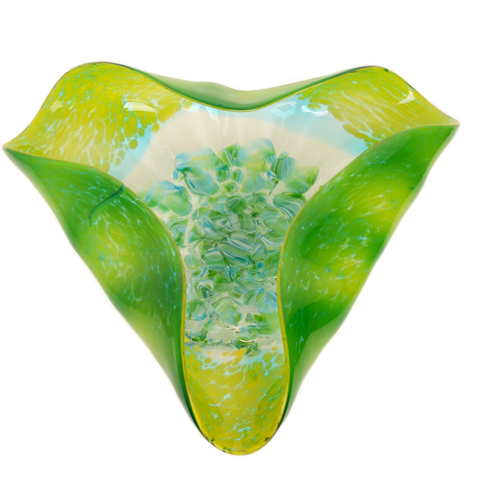 Introducing the "Nova Verdant Glow," a striking handblown art glass three-folded platter by Viz Glass. This exquisite piece is a celebration of nature's vitality, capturing the essence of lush greenery in a form that is both visually stunning and functional.