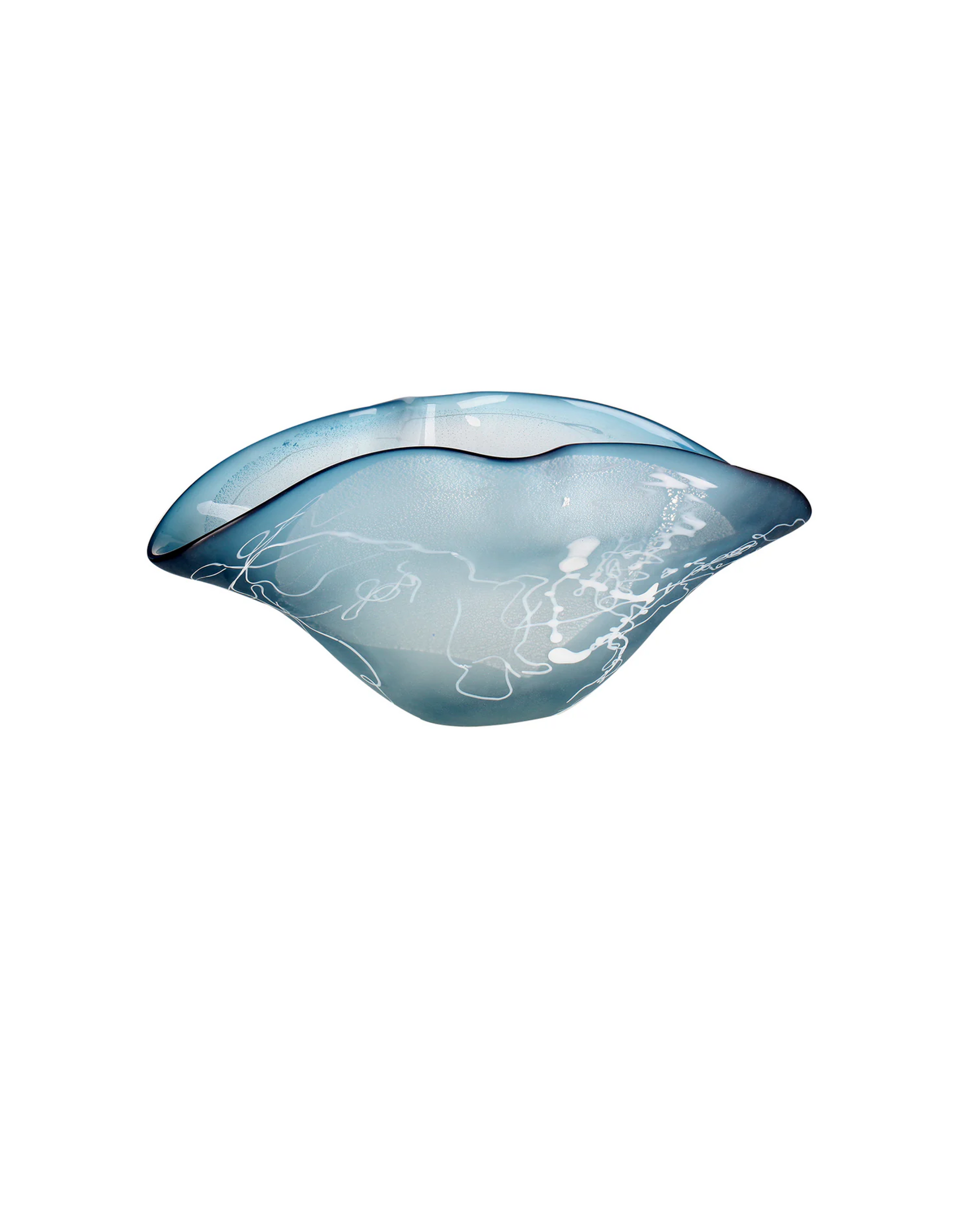 The "Whispering Tide" vase features a gracefully folded design, reminiscent of the soft undulations of the sea as it caresses the shore. Its ethereal blue hue evokes the calming presence of coastal waters, while intricate white swirls trace delicate patterns across the surface, like sea foam dancing atop the waves. The translucent quality of the glass allows light to pass through, creating a mesmerizing interplay of shadows and highlights that changes with every angle.