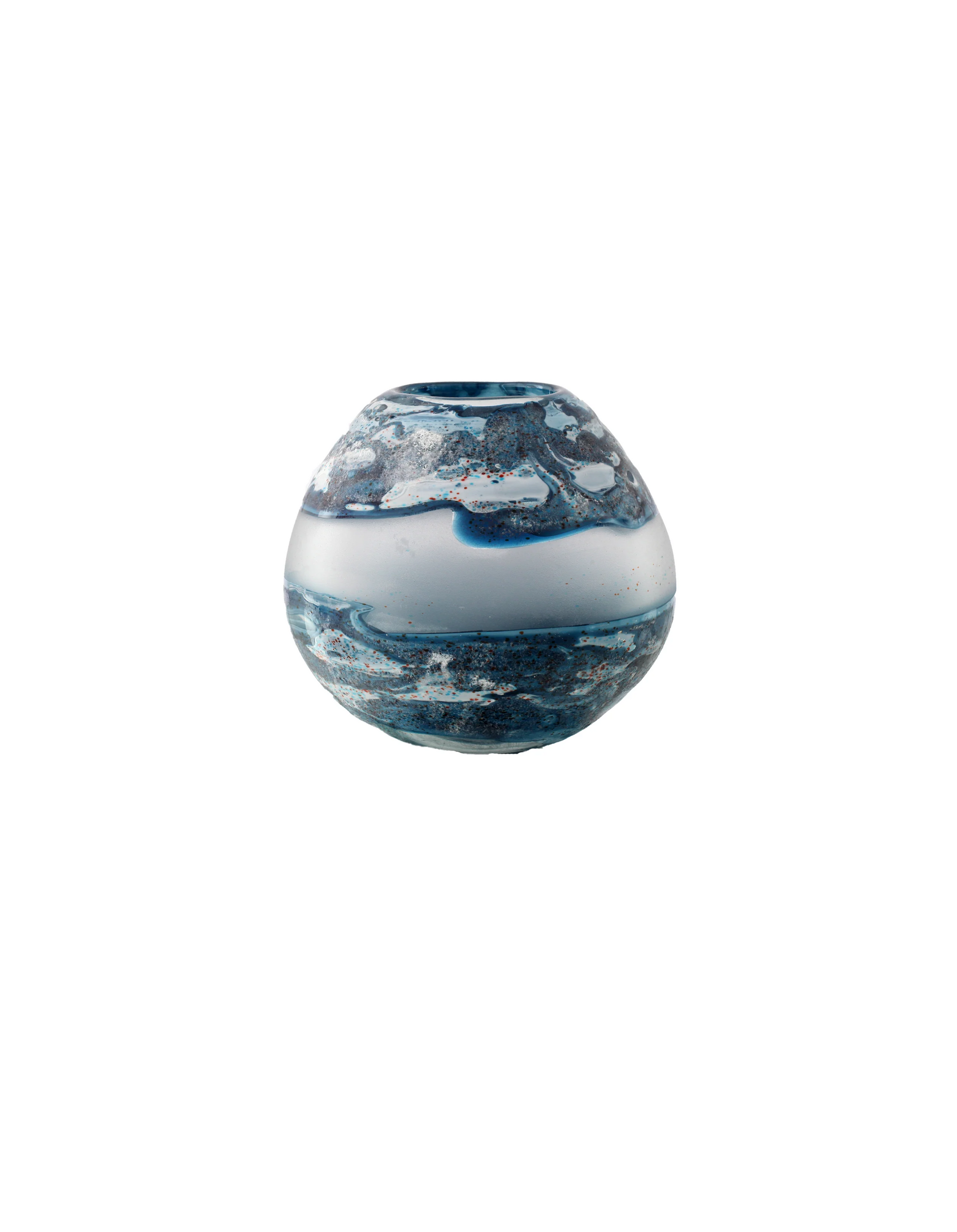 The "Oceanic Horizon" vase features a rounded, globular shape that mirrors the curves of the earth, bringing a sense of balance and harmony to its form. The glass is infused with deep, swirling blues and soft, misty whites, capturing the essence of ocean waves gently lapping against the shore under a cloudy sky. Subtle speckles and intricate textures within the glass evoke the natural variations found in the ocean’s surface, creating a dynamic and ever-changing visual experience.
