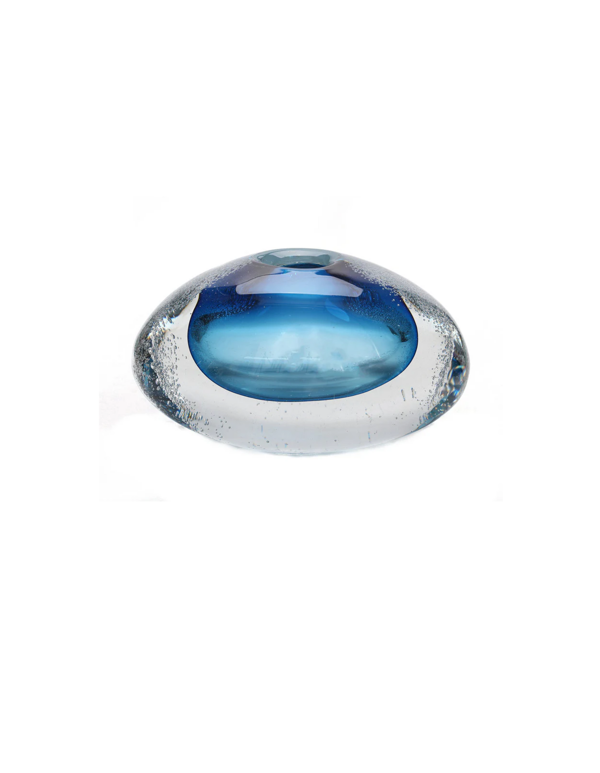 The "Midnight Gem" vase features a sleek, low-profile design with a rounded, pebble-like shape that evokes the smooth, polished stones found on a tranquil shoreline. The deep, rich blue at the heart of the vase is encased in a crystal-clear glass exterior, creating a stunning visual effect that captures the essence of a midnight tide gently lapping against the shore. Tiny bubbles suspended within the glass add texture and depth, resembling the last traces of air rising through the water.