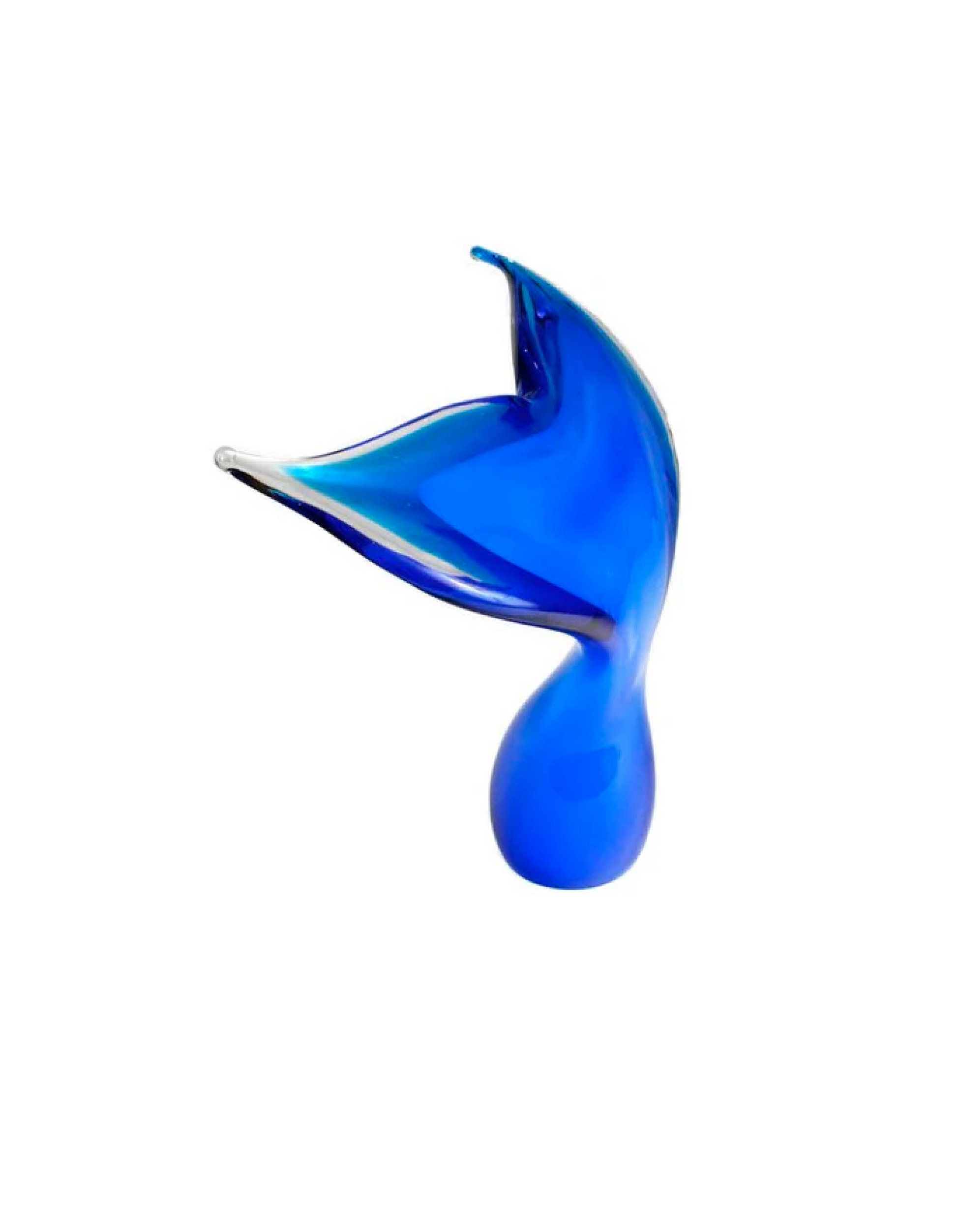 The "Ocean's Grace" sculpture is crafted from a vibrant blue glass that echoes the depths of the ocean. The sleek, fluid lines of the whale's tail rise gracefully, capturing a moment of pure natural beauty. The subtle gradient of color and the smooth, polished surface create a dynamic interplay of light and shadow, bringing the sculpture to life as it catches and reflects light from different angles.