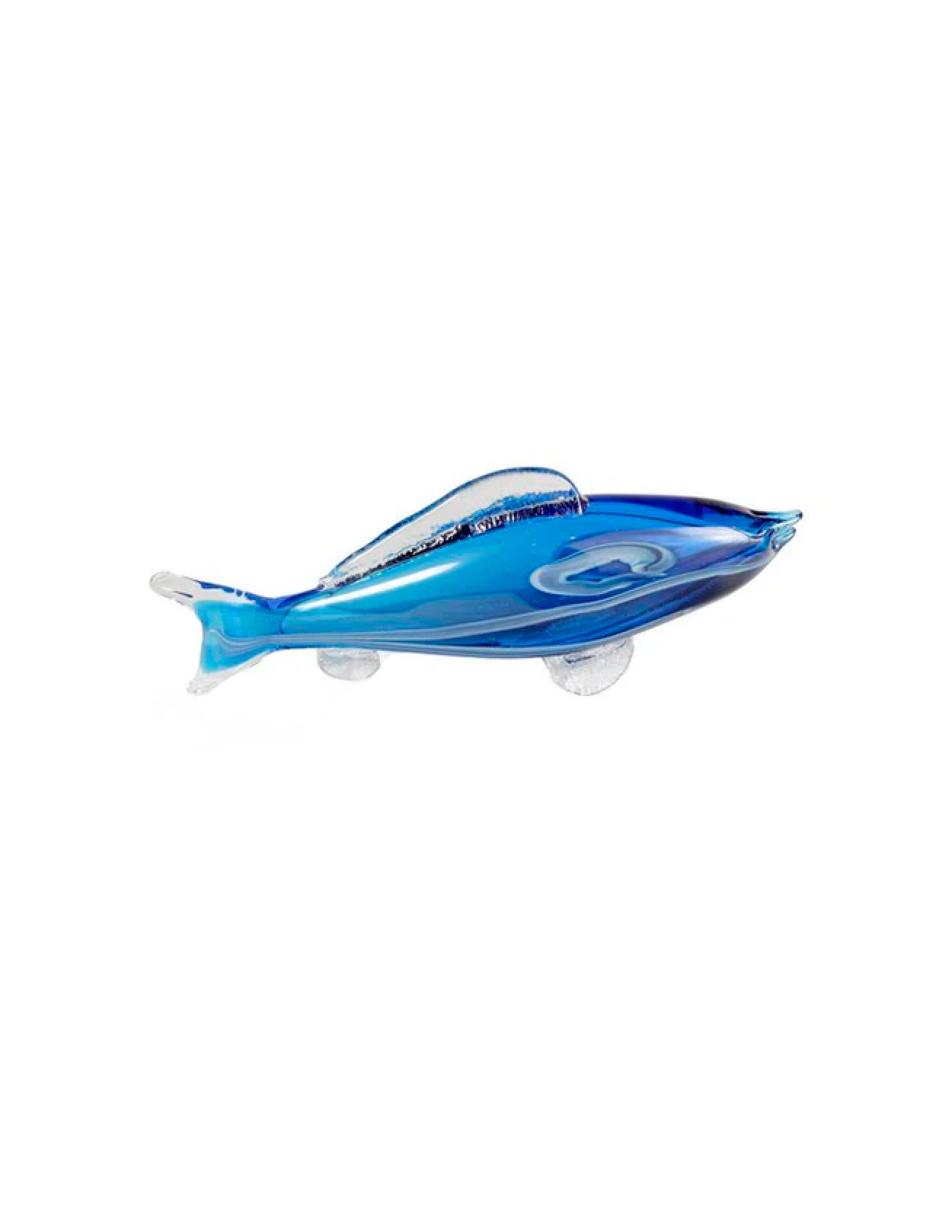 Immerse yourself in the tranquil beauty of the ocean with the "Azure Glide" handblown art glass fish sculpture by Viz Glass. This elegant piece captures the sleek and graceful movement of a fish swimming through the deep blue waters, bringing a touch of the sea’s serenity into your space.