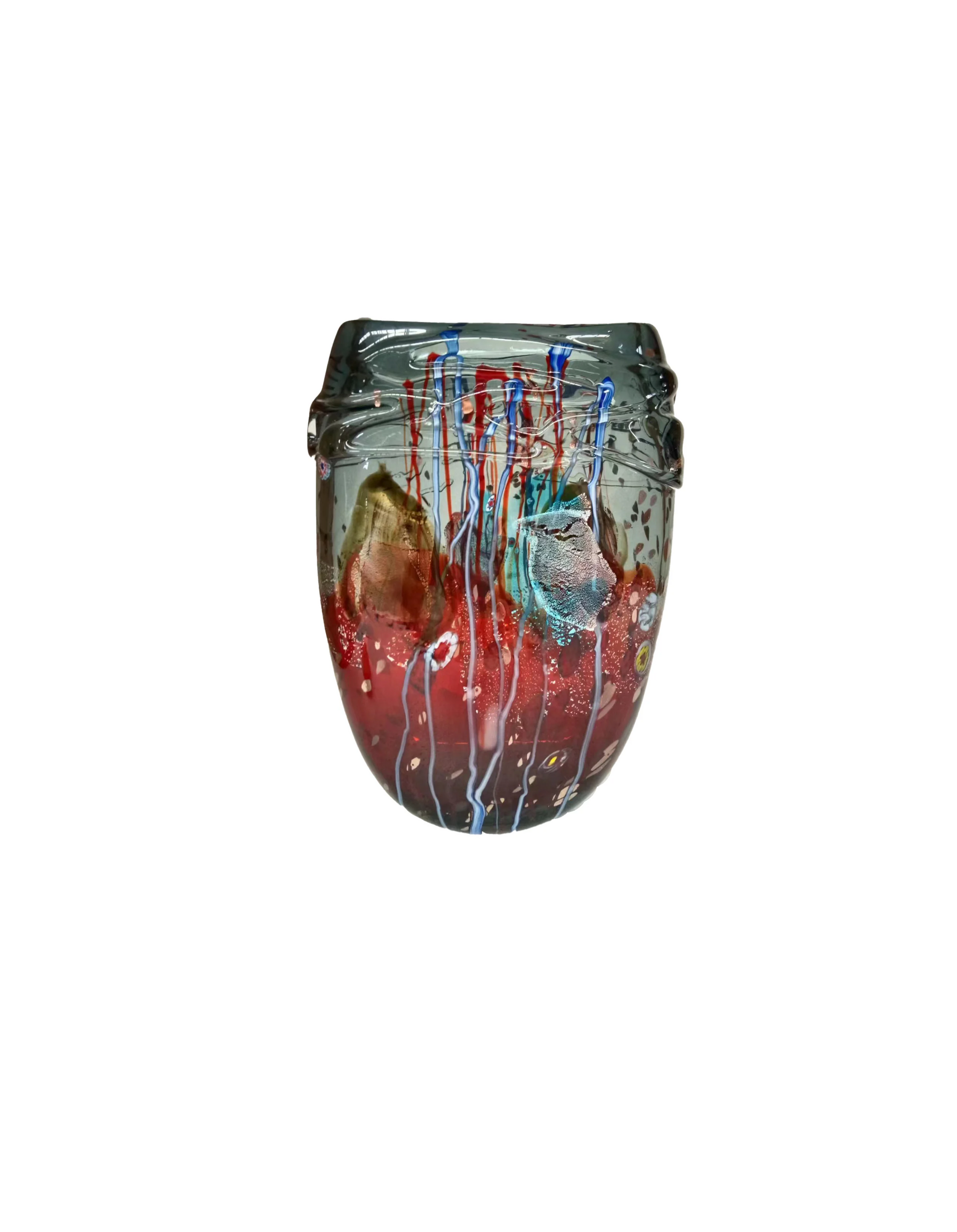 The "Color Mosaic" vase features a rich tapestry of colors, blending deep reds, golden ambers, and vibrant blues with delicate trails of white and silver. The intricate, organic patterns mimic the dense foliage and flowing streams of a hidden forest, creating a captivating visual narrative. The textured surface, adorned with bubbles and layers of glass, adds depth and dimension, making the vase appear alive with movement and color.