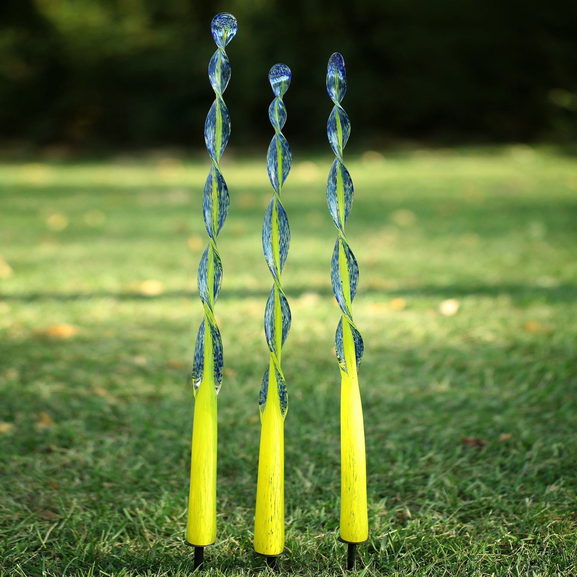 This eye-catching colored garden glass are adorned with a twisted color accent that evoke a sense of magic and whimsy. The contrast in color gives the Bloom Twist Leaf set is signature look. Sold as a set of 3, each glass piece ranges between 26" to 28" in length and come with ground stake that fits loosely into the bottom of the glass stem.