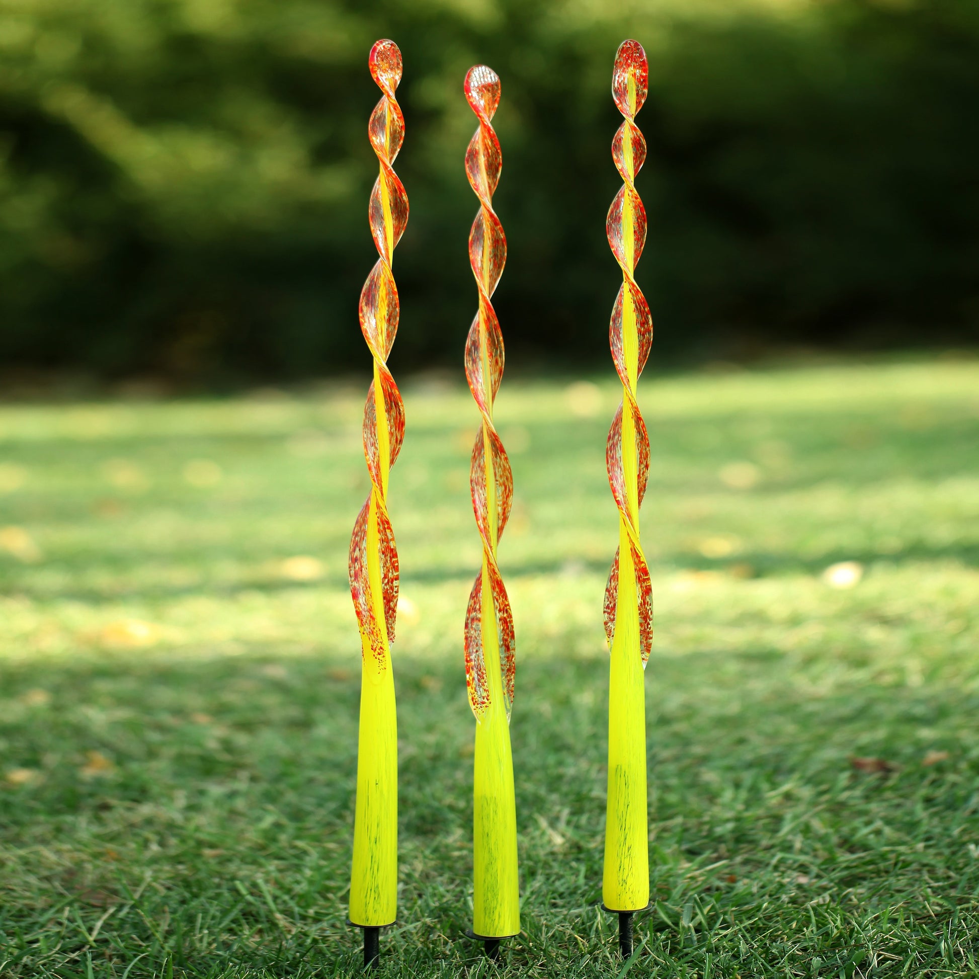 This eye-catching colored garden glass are adorned with a twisted color accent that evoke a sense of magic and whimsy. The contrast in color gives the Bloom Twist Leaf set is signature look. Sold as a set of 3, each glass piece ranges between 26" to 28" in length and come with ground stake that fits loosely into the bottom of the glass stem.