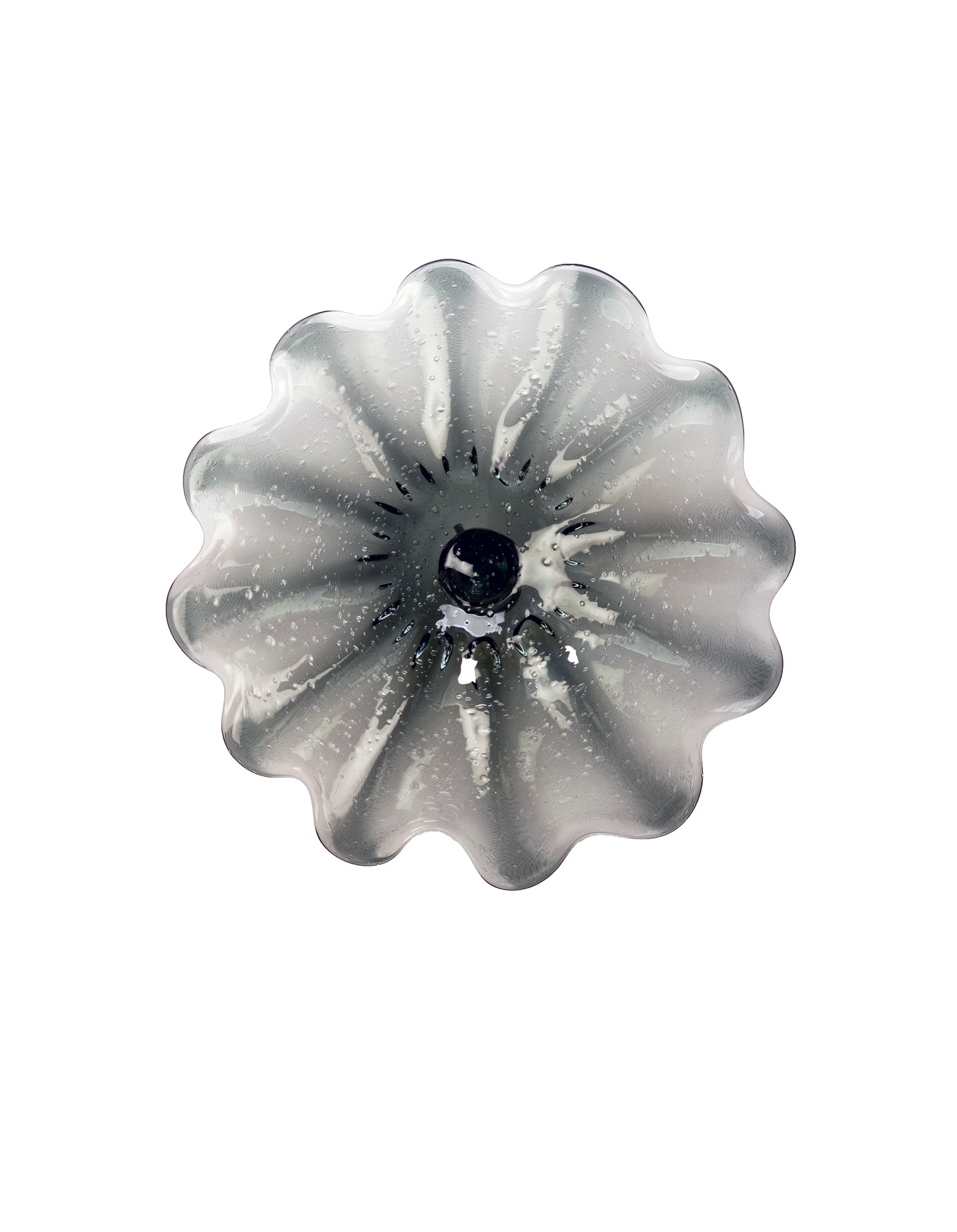 The Silver Mist wall art features soft, smoky gray tones that radiate from the center in a rippling, wave-like pattern, giving the piece a misty, cloud-like appearance. The seeded bubbles, suspended within the glass, capture and reflect light, adding depth and texture to the design. The gently scalloped edges evoke the natural curves of a flower petal or a cloud, enhancing the serene and organic feel of the piece.
