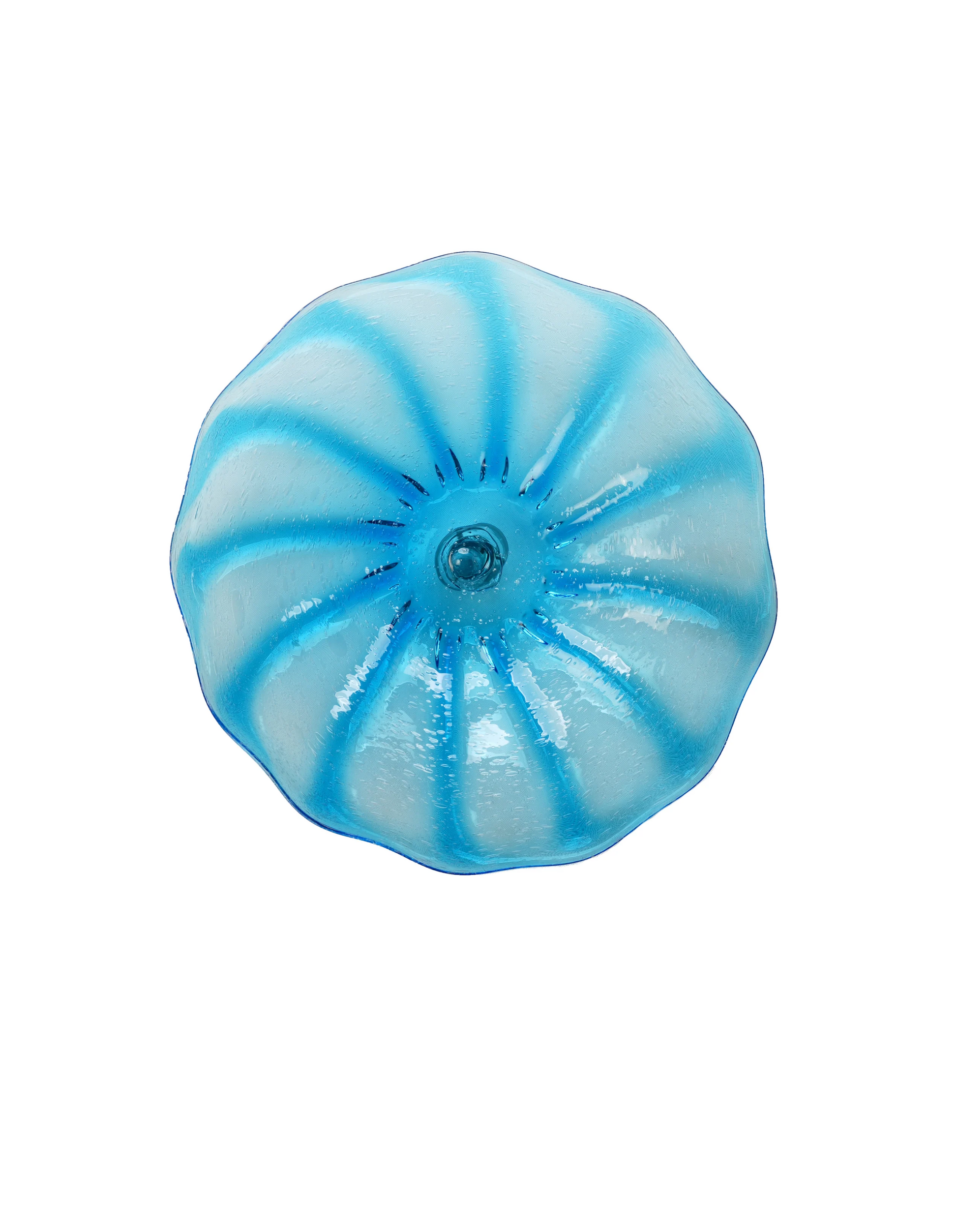 The Aqua Bloom wall art is bathed in cool, refreshing shades of aqua blue, reminiscent of crystal-clear waters. Its gently scalloped edges add an organic elegance, mimicking the bloom of a flower or the ripple of water spreading outward. What truly sets this piece apart is the delicate pattern of bubbles encapsulated within the glass, creating a dynamic visual effect as light reflects and dances off the surface.