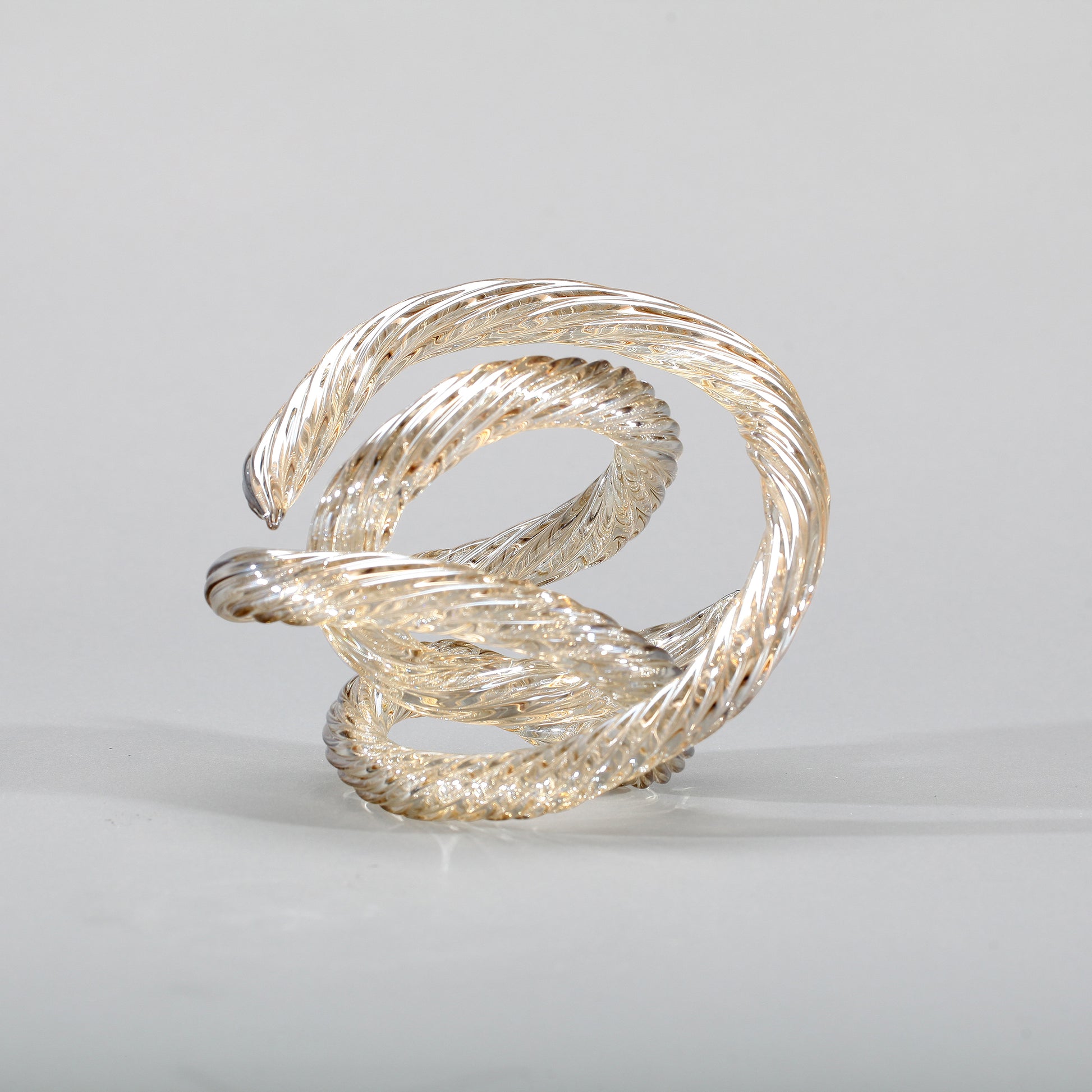 The Infinity Knots sculpture features gracefully intertwined glass strand, delicately twisted into continuous loops. The subtle golden hues of the champagne-colored glass are accented by its intricate textures, creating a luminous effect as it catches and refracts light. The detailed ridges enhance their sculptural depth, making it a striking focal point in any space.