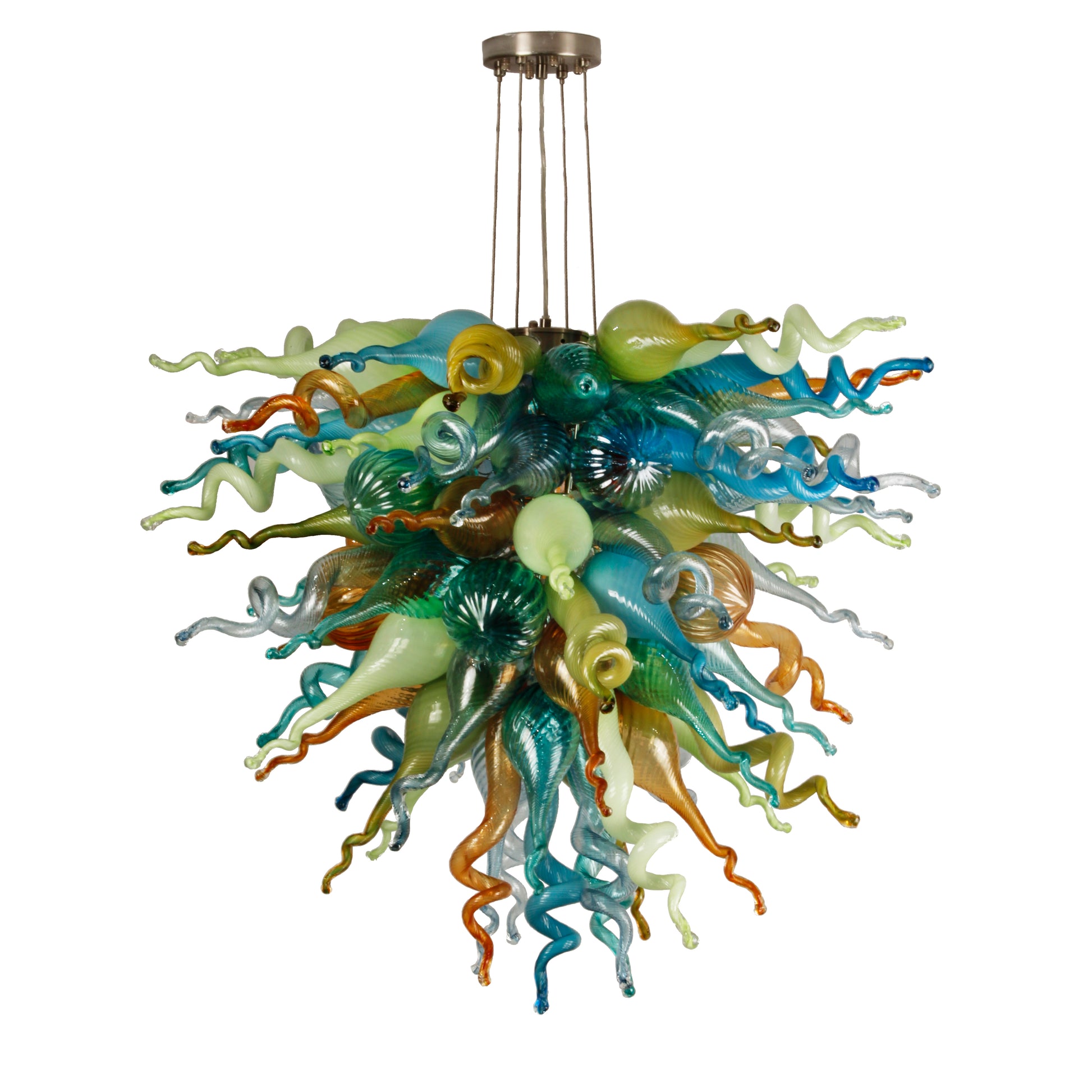 The ColorSelect Fiesta Coral Large Chandelier is equal parts Ink Blue (IB), Light Red (LR), Clear (C), Mint (M), Olive Green (OG), Ocean Green (TG), Blue Grey (BG) , or create your own design from our pallet of 24 colors.